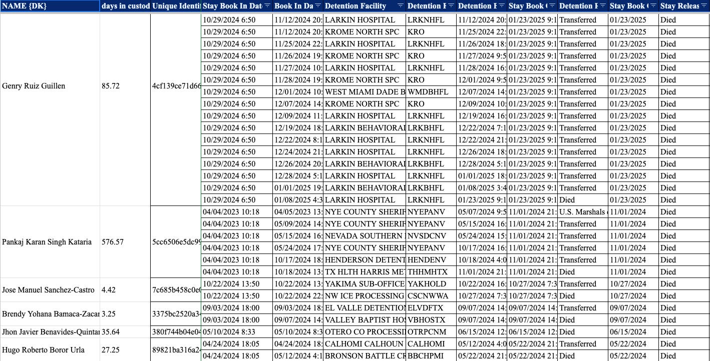 The first thing I’m looking at in this dataset are the people in the “Detentions” spreadsheet whose Stay Release Reason is listed as “Died”. If we add a filter and sort that column, we can find all those entries. Because the datasets contain both unique identifiers (far right column) and a date of death, we can correlate what we’re seeing in the spreadsheet with the public database I maintain and find out whose death is counted, and whose isn’t, within this dataset.