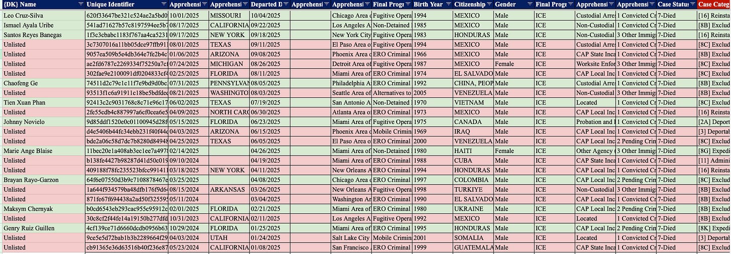 What’s left staring back at me, taunting, are 15 arrests of people ICE say it arrested during the first 10 months of 2025 whose case status is “Died” but who are not listed in any ICE death data. Six of these folks have no final order of removal, according to the dataset, meaning they should not have been deported. The ages, locations of arrest, and countries of citizenship don’t match up with public reports I’m following.