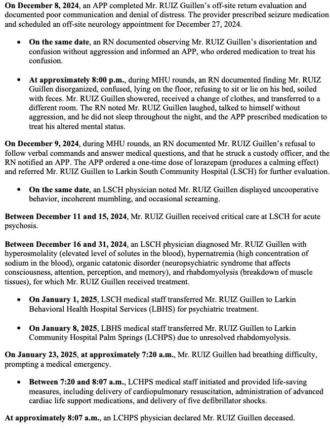 That was what happened with 29 year-old Honduran national Genry Ruiz Guillen, who spent 85 days in ICE custody going back and forth between Krome and various hospitals in south Florida. Reading over his dummy death report, it is clear that something was really, really wrong, likely exacerbated by poor care at Krome. He went from having dizziness to seizures to being diagnosed as ‘psychotic’ to being “catatonic” and experiencing a breakdown of muscle tissues (rhabdomylolysis).