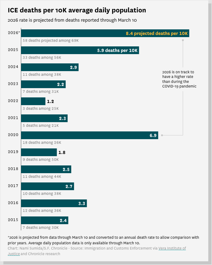 Yesterday a team of journalists at the San Francisco Chronicle released a groundbreaking new piece of work on deaths in ICE custody under Trump. I don’t wanna tell you what to do, so I’ll kindly suggest that if you’re here, you might stop reading this and go read that.