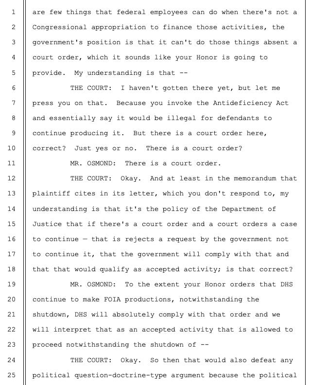 Anthony Enriquez with RFK Human Rights reports that in a FOIA case out of the Southern District of New York, ICE attempted to tell a federal judge that the government shutdown means he lacked the power to enforce the order he’d previously entered for ICE to produce records. A transcript from the hearing reveals Judge Furman was not amused: