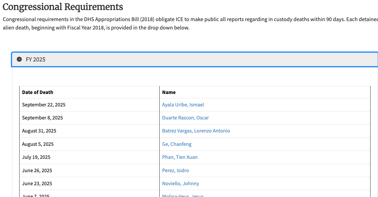 Right underneath the part of its Detainee Death Reporting website where the agency says a 2018 congressional mandate requires a death report to be published within 90 days of a person’s death in ICE custody, ICE omits a death report for Santiago.