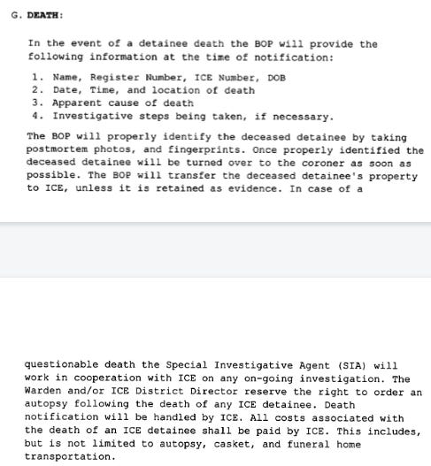 As I discussed following the June 2025 death Johnny Noviello—the first person in ICE custody at a BOP facility in more than a decade—ICE and BOP executed a memorandum of agreement in February allowing people civilly detained for immigration violations to be housed in prisons designed to punish folks convict of crimes. The provision for how deaths get investigating this MOA includes doesn’t actually state whether ICE’s death policy applies.